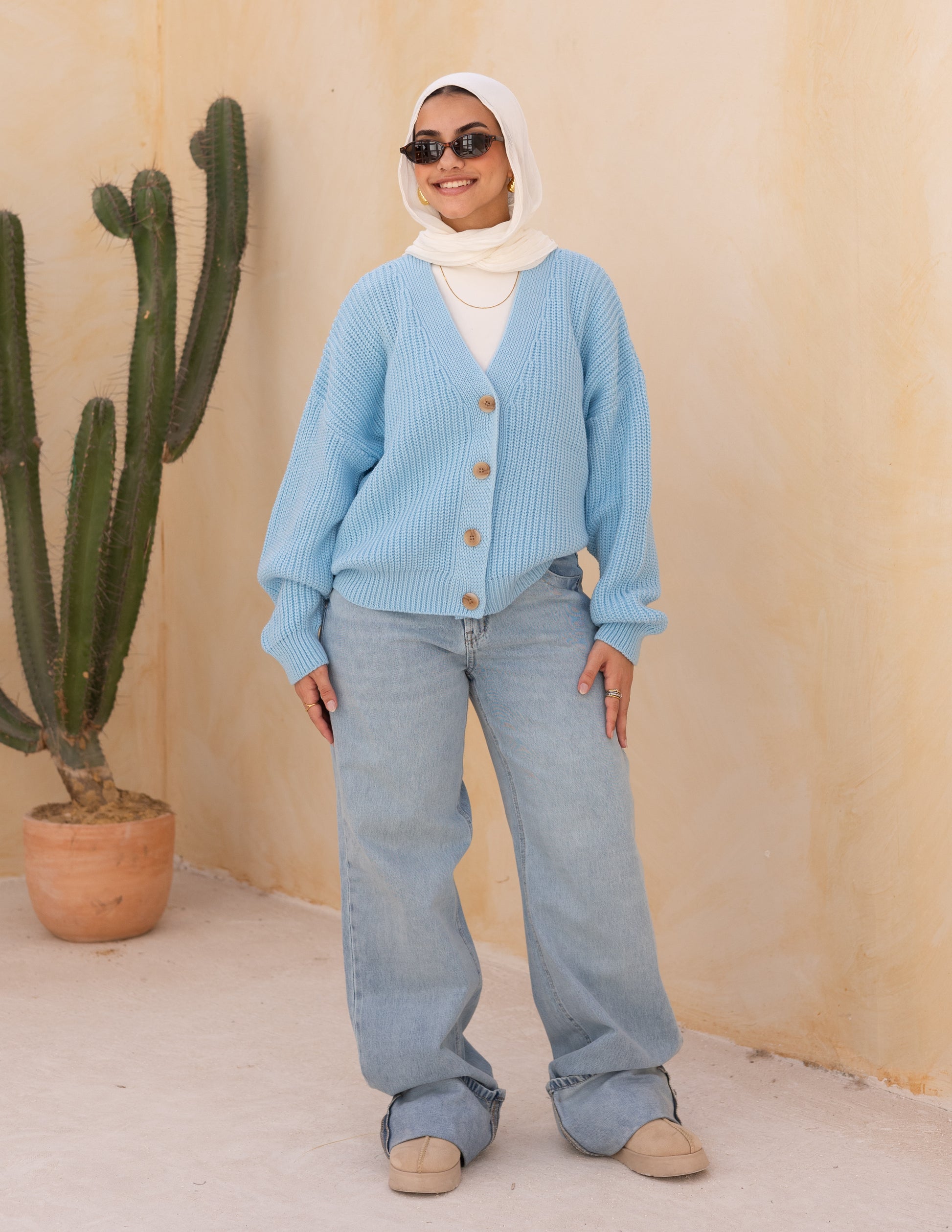 Elevate your casual wardrobe with this versatile Baby blue short sweater, designed for effortless style and comfort. The button-front closure offers easy layering and adjustable fit, making it perfect for transitional seasons or layering over your favorite pieces. Crafted with a contemporary cut, this sweater delivers a polished yet relaxed aesthetic that works seamlessly from day to evening. Whether paired with denim, trousers, or skirts, it's a wardrobe essential that combines fashion-forward design with practical wearability.