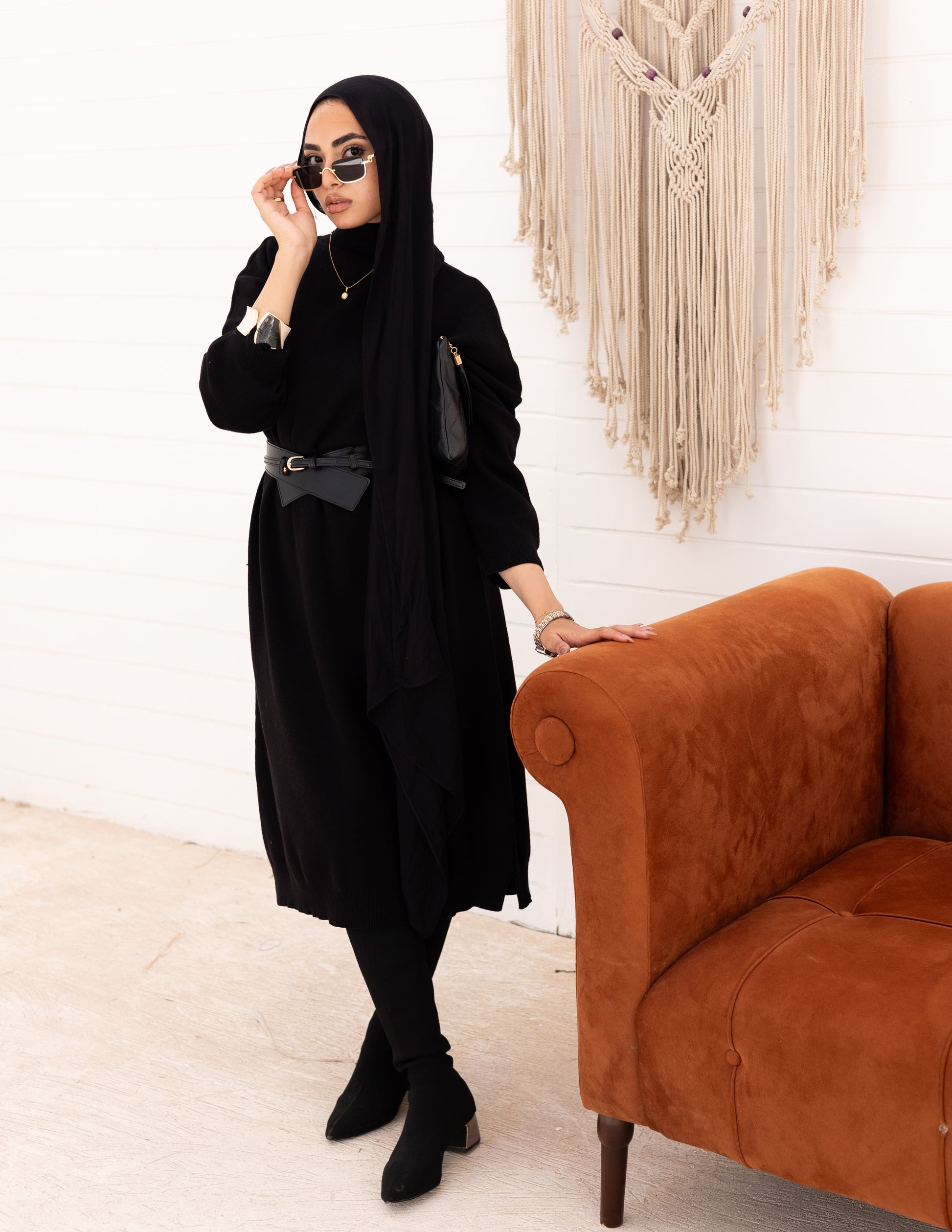 Elevate your everyday wardrobe with this essential knitted short dress in timeless black. Crafted for the modern woman who values both comfort and sophistication, this piece seamlessly transitions from casual outings to semi-formal occasions. The modest silhouette flatters all body types while maintaining a chic, contemporary aesthetic. Versatile enough to style with sneakers or heels, this wardrobe staple pairs effortlessly with layering pieces for year-round wear.