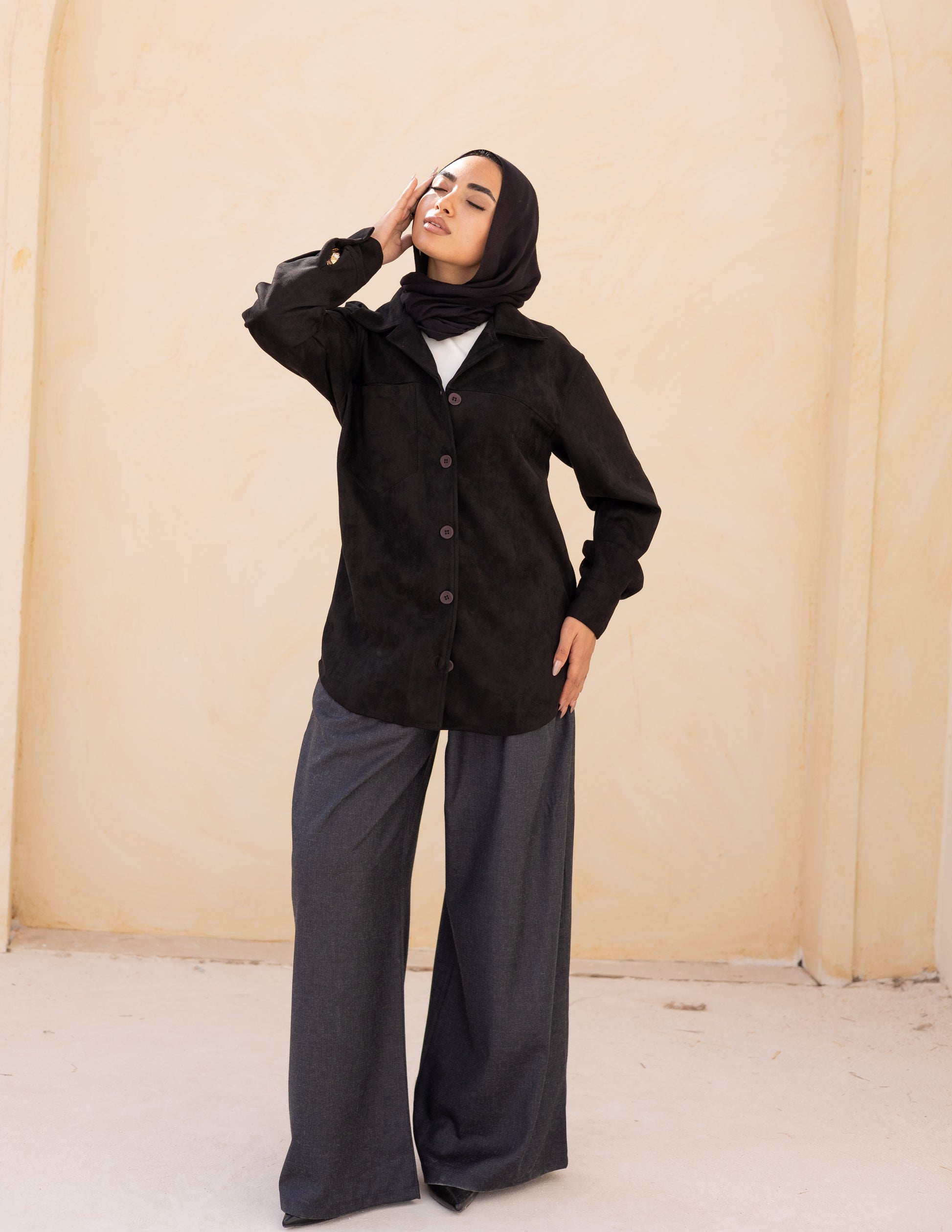 Discover refined casual elegance with this Black suede shirt, a sophisticated staple for your daily rotation. The luxurious suede fabric provides exceptional softness and a subtle sheen that elevates basic styling. Its neutral palette adapts seamlessly to any occasion—pair with tailored trousers for understated polish or layer over basics for relaxed sophistication. Built to withstand regular wear while maintaining its supple texture, this piece rewards those who value quality materials and timeless design. An investment in versatile, everyday luxury.