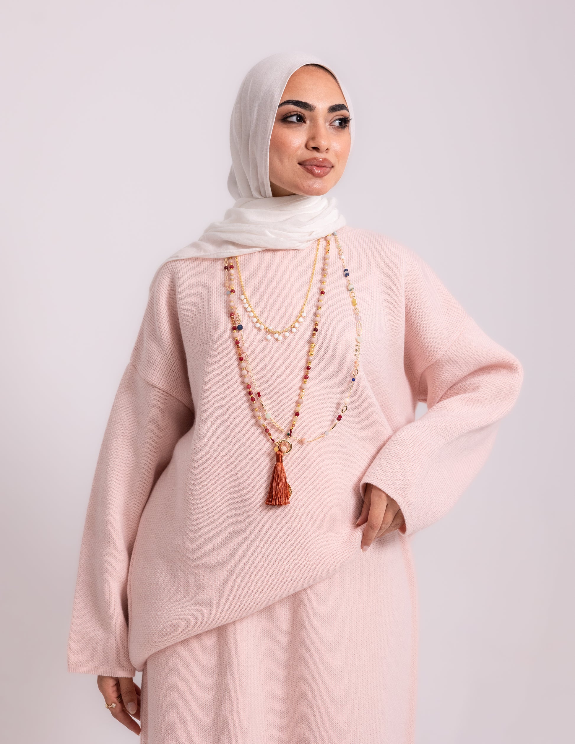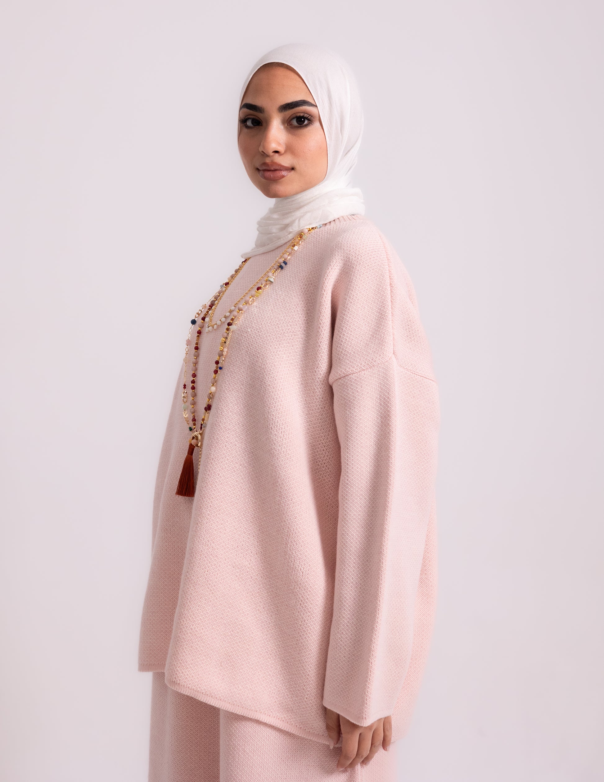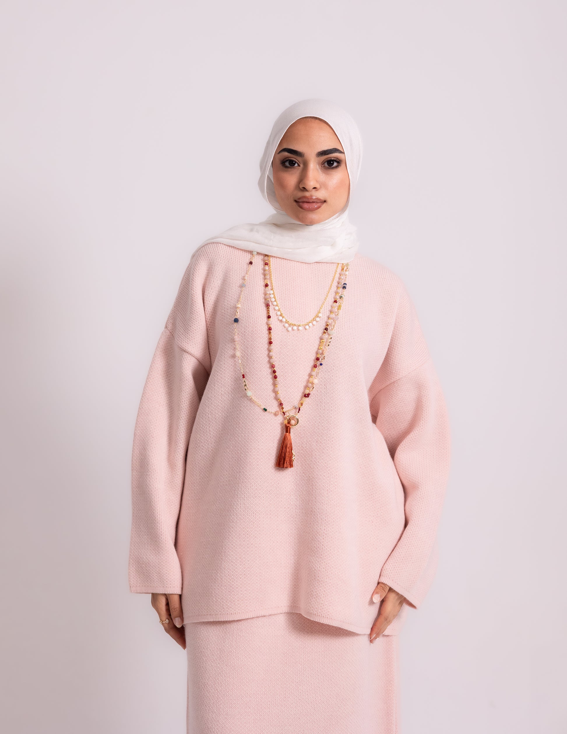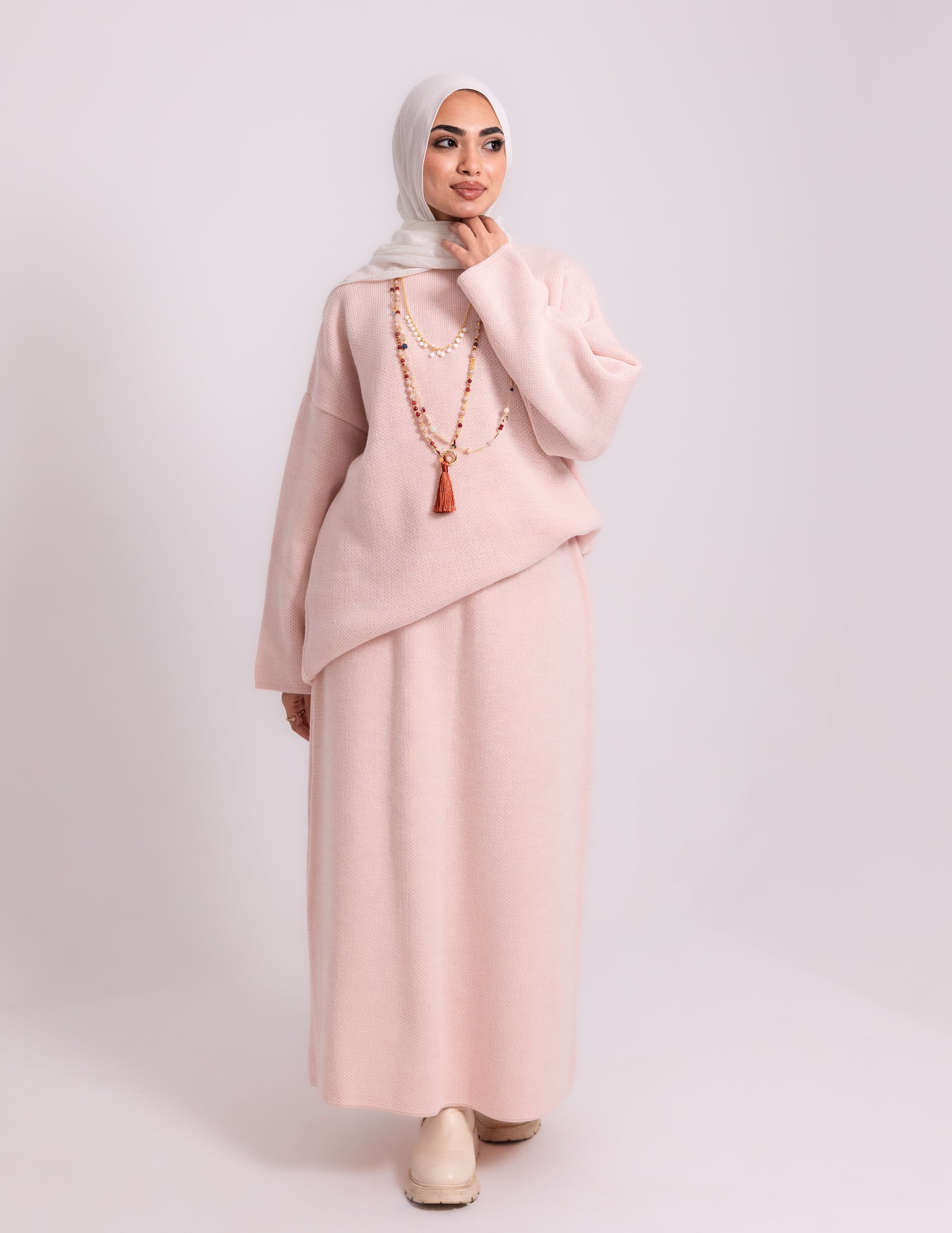 # Rose Set _ Baby pink Elevate your modest wardrobe with this expertly crafted baby pink knit set, designed for those who value both coverage and contemporary style. The coordinated pieces work seamlessly together, offering versatile layering options that transition effortlessly from day to evening. Rich baby pink tones complement all skin tones while maintaining a refined, understated elegance. Perfect for creating polished looks that honor your personal style without compromise.