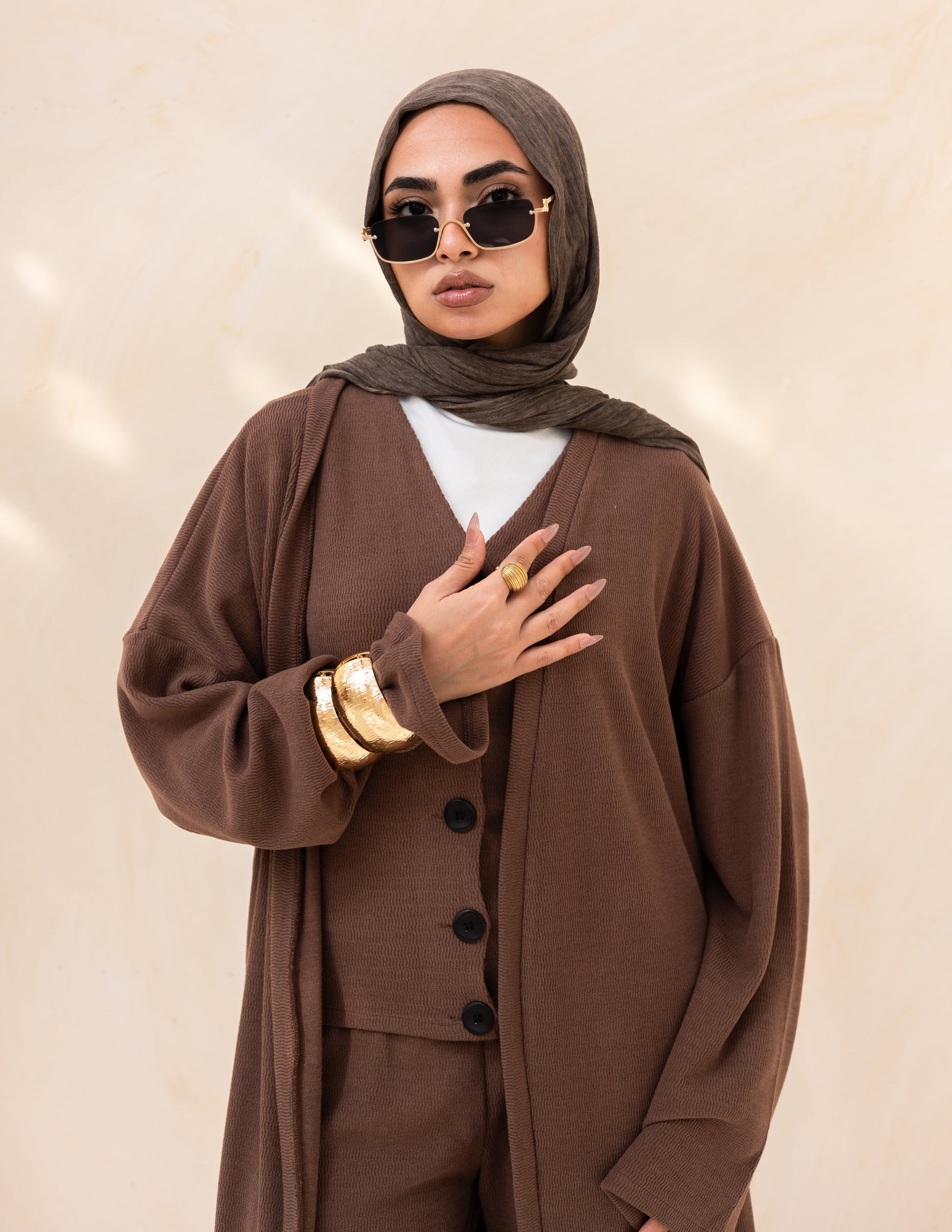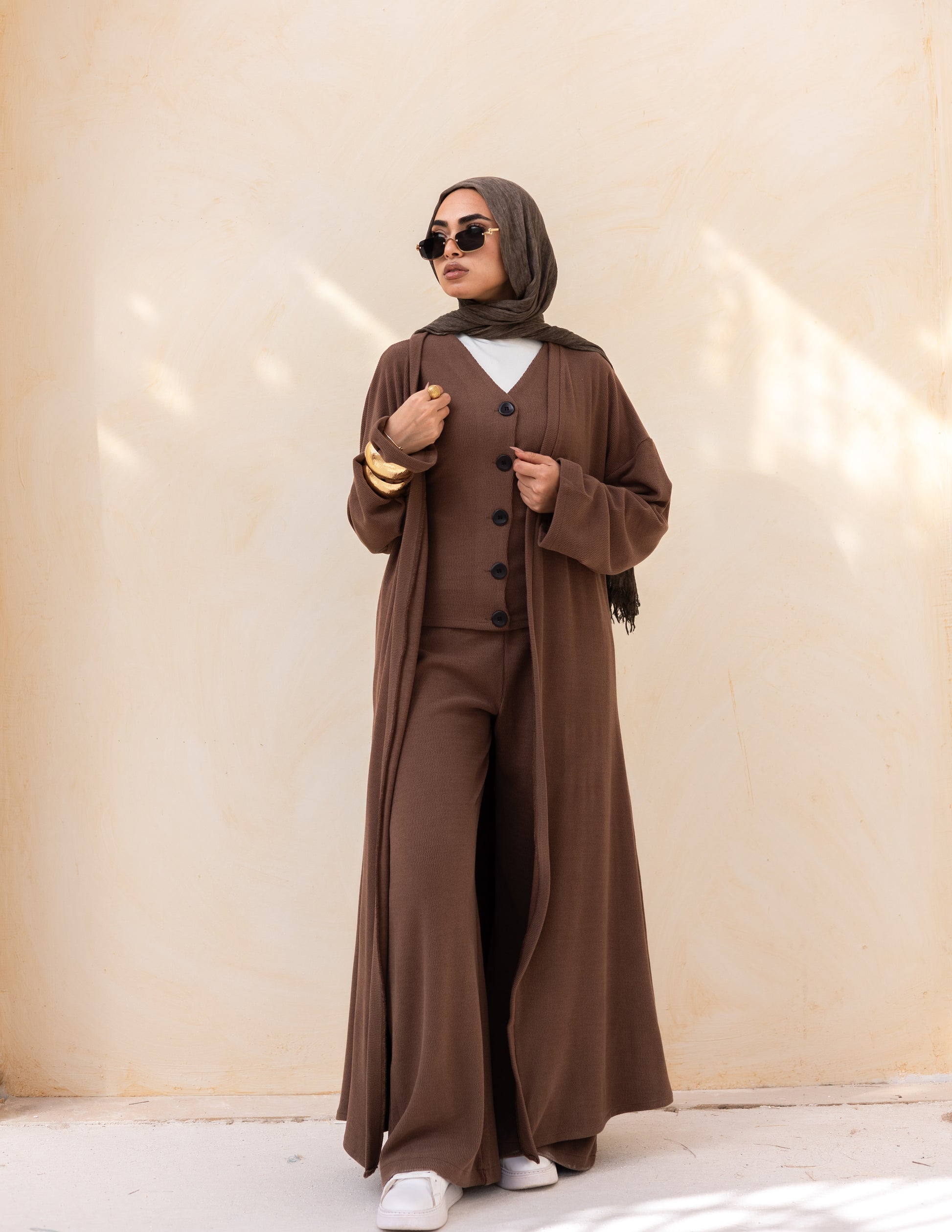 The Rafi Set combines contemporary design with timeless elegance, featuring a beautifully crafted knitted vest paired with coordinating pieces for effortless layering. Perfect for winter styling, this modest ensemble delivers sophisticated warmth without compromising on fashion-forward appeal. The soft beige palette works seamlessly with any wardrobe, while premium knit construction ensures lasting comfort and durability. Ideal for those seeking refined, modest fashion that transitions gracefully from casual to formal occasions.