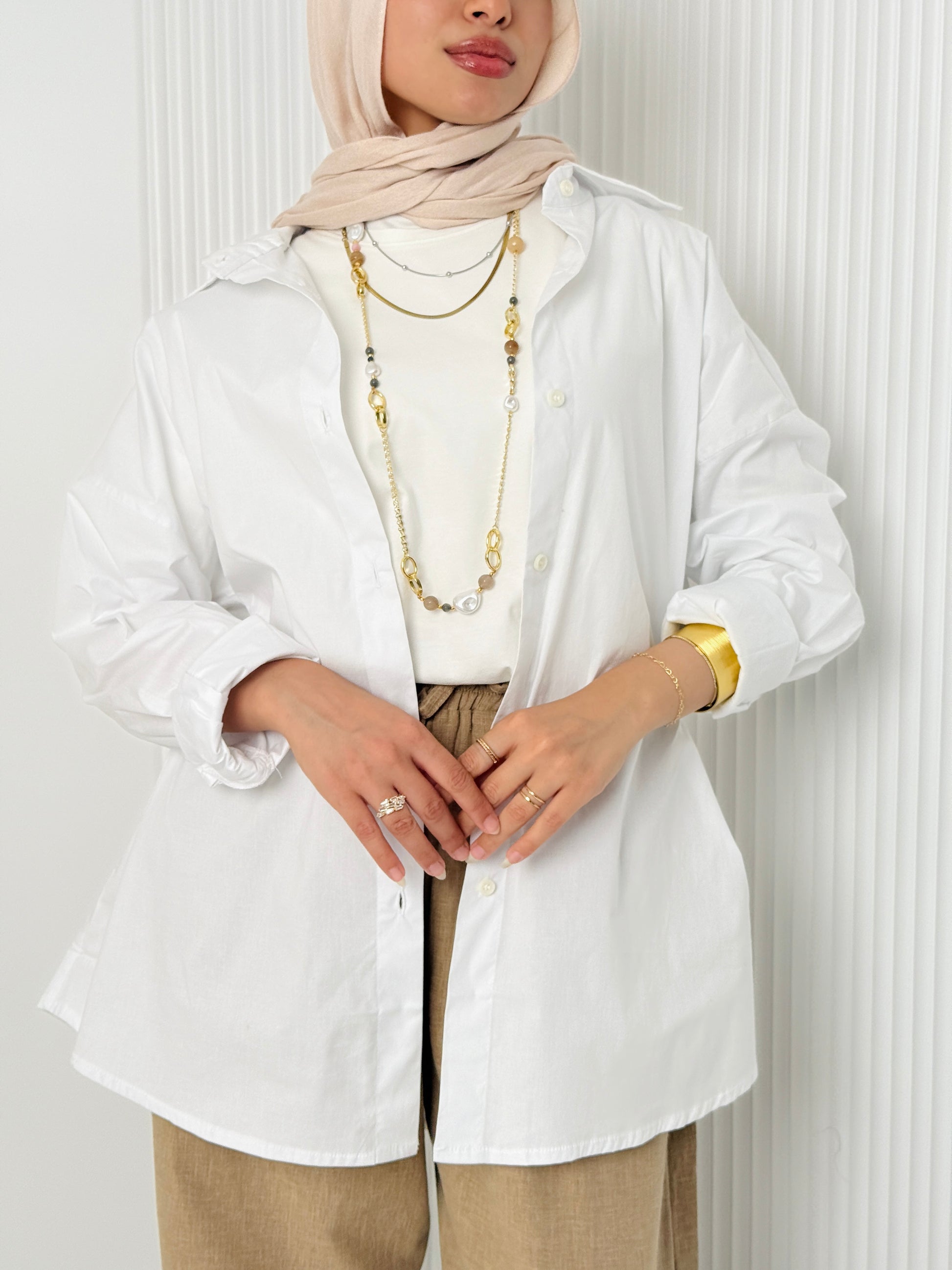 Made from high-quality cotton poplin, this timeless shirt boasts an oversized fit for a fashionable and modest look. Keep comfortable and stylish with this versatile piece, crafted with quality and care. The perfect addition to any wardrobe.